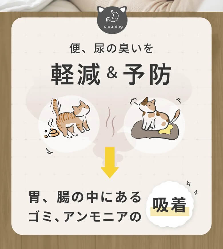 老廃物やコレステロールの吸着&排出を助け、胃、腸のゴミの吸着&アンモニアの吸着、抗酸化作用などにより腎臓ケアやダイエット、尿や便のニオイのお悩みやエイジングケアにもおすすめです。