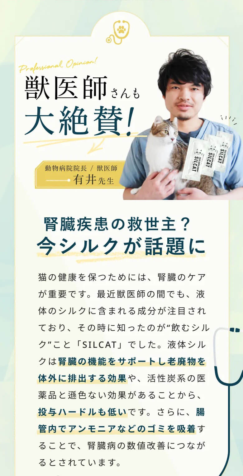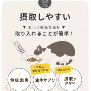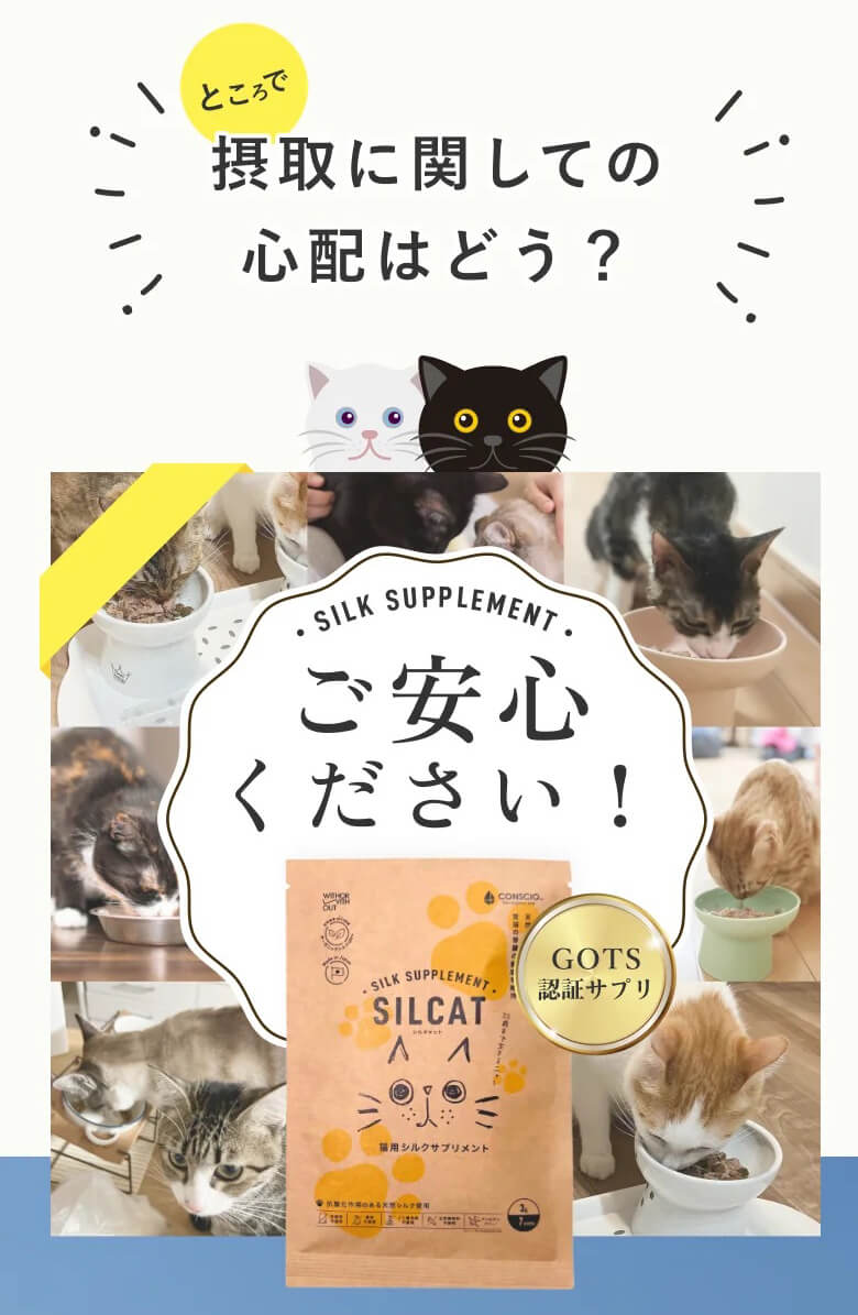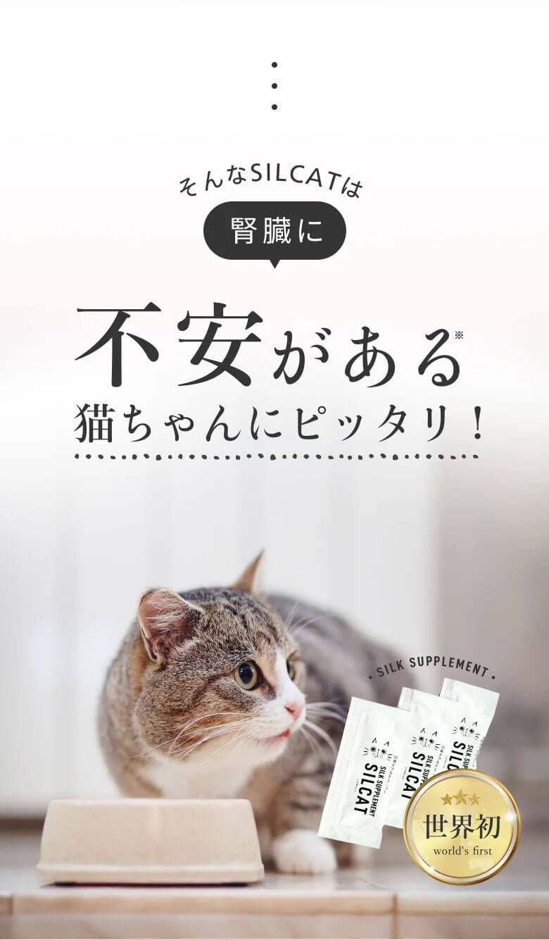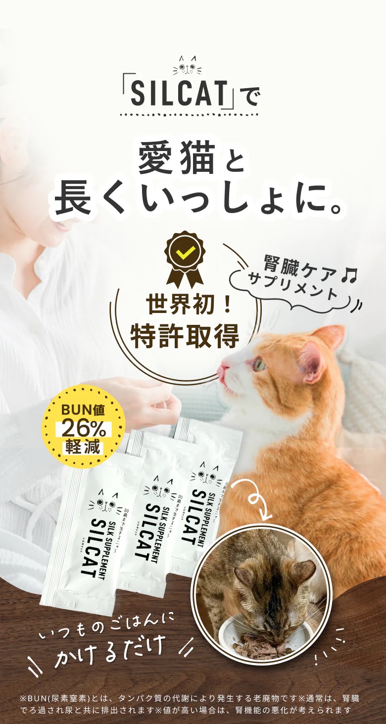特許技術「高分子量シルクフィブロイン水溶液」を活用した、世界初の猫用腎臓ケアサプリメント。