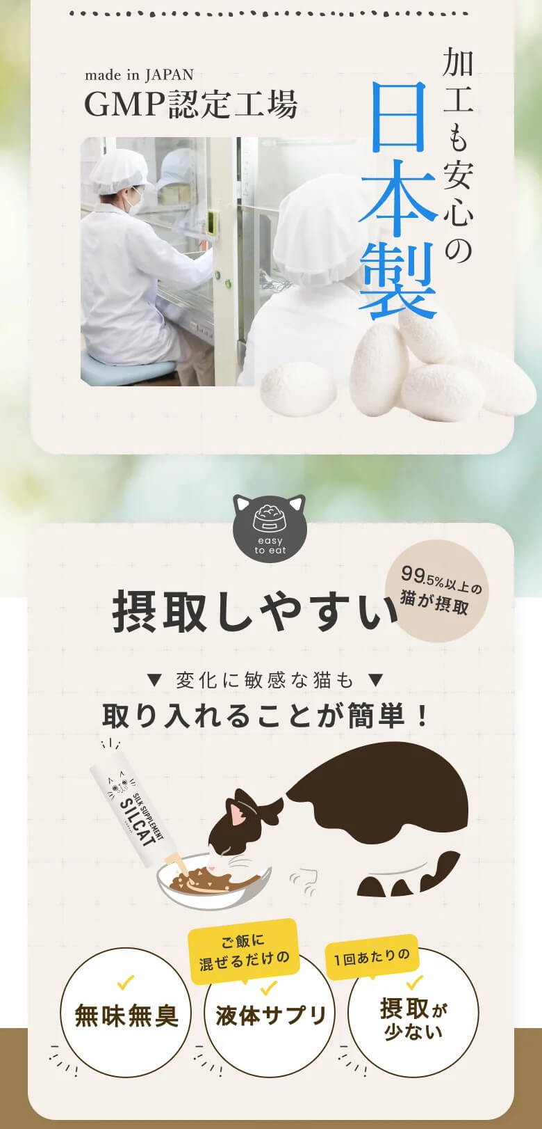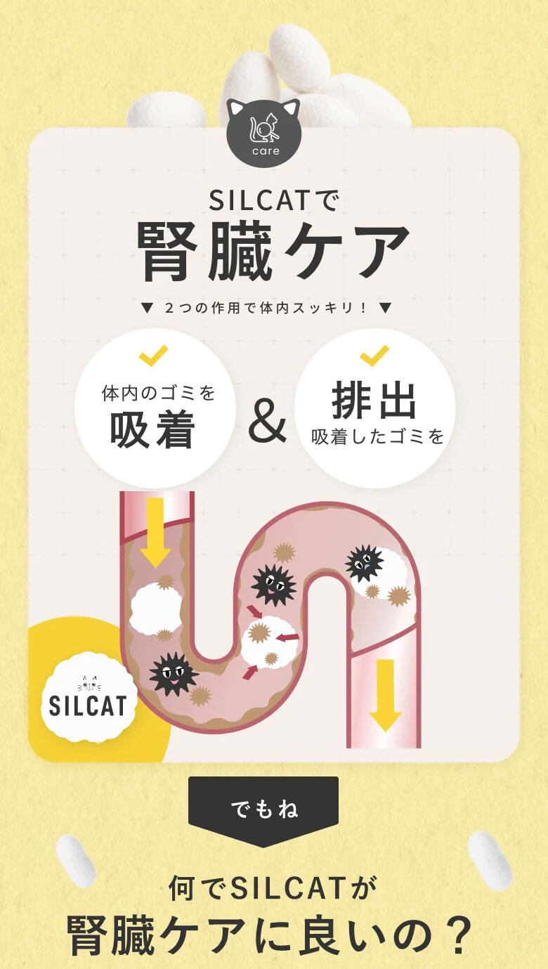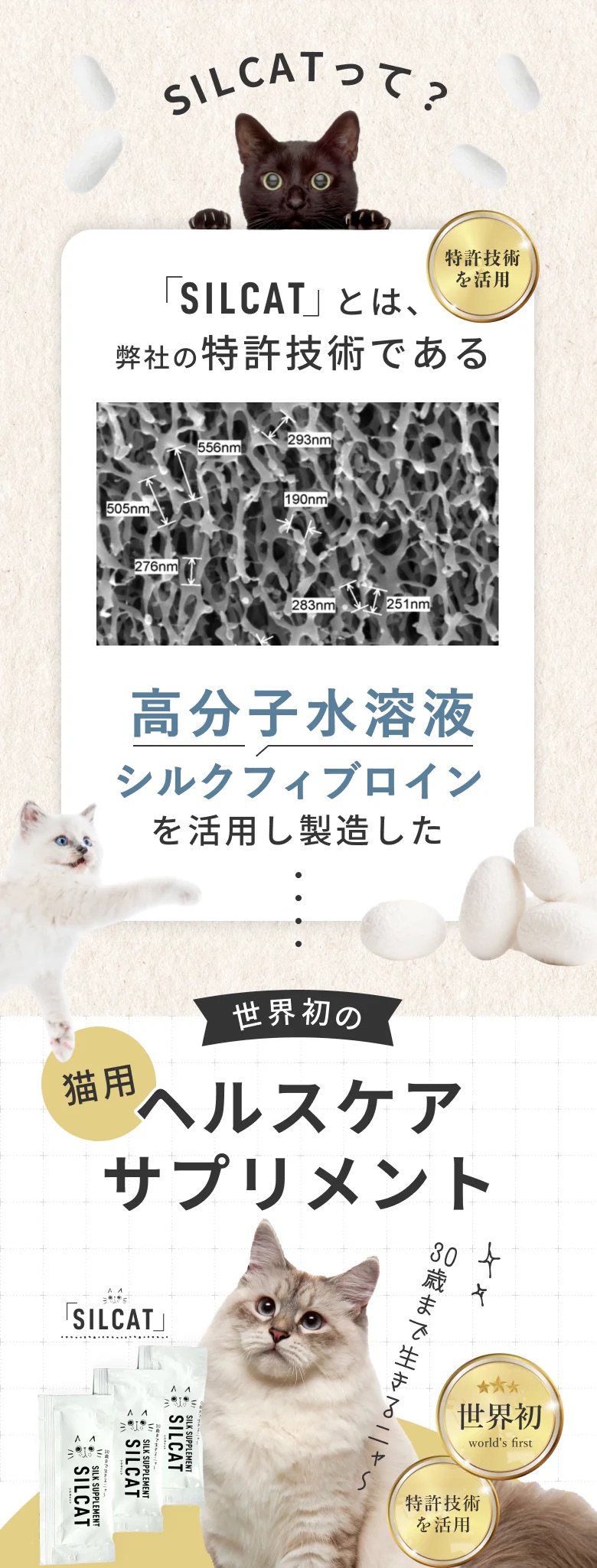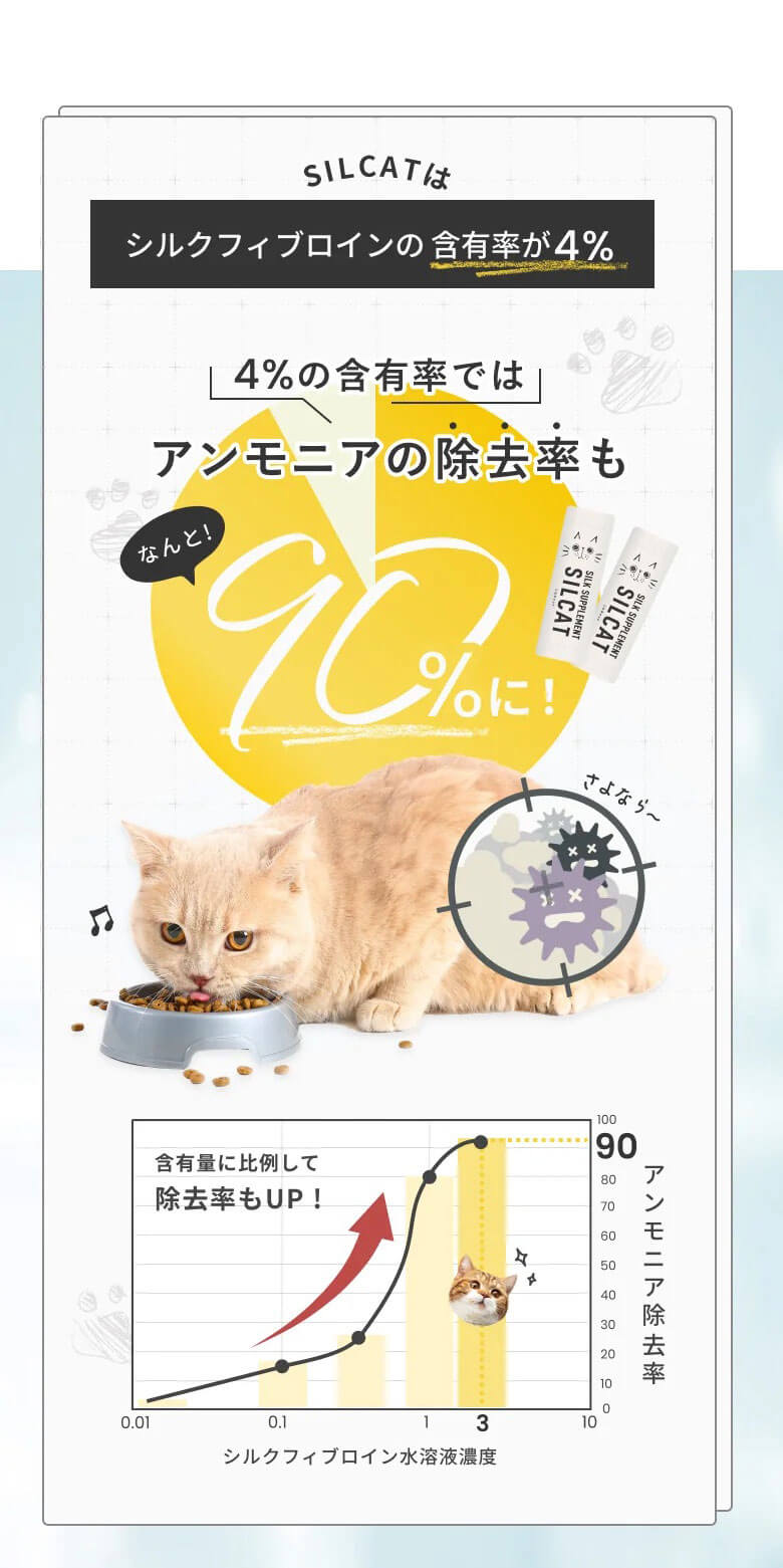 特許技術「高分子量シルクフィブロイン水溶液」を活用した、世界初の猫用腎臓ケアサプリメント。