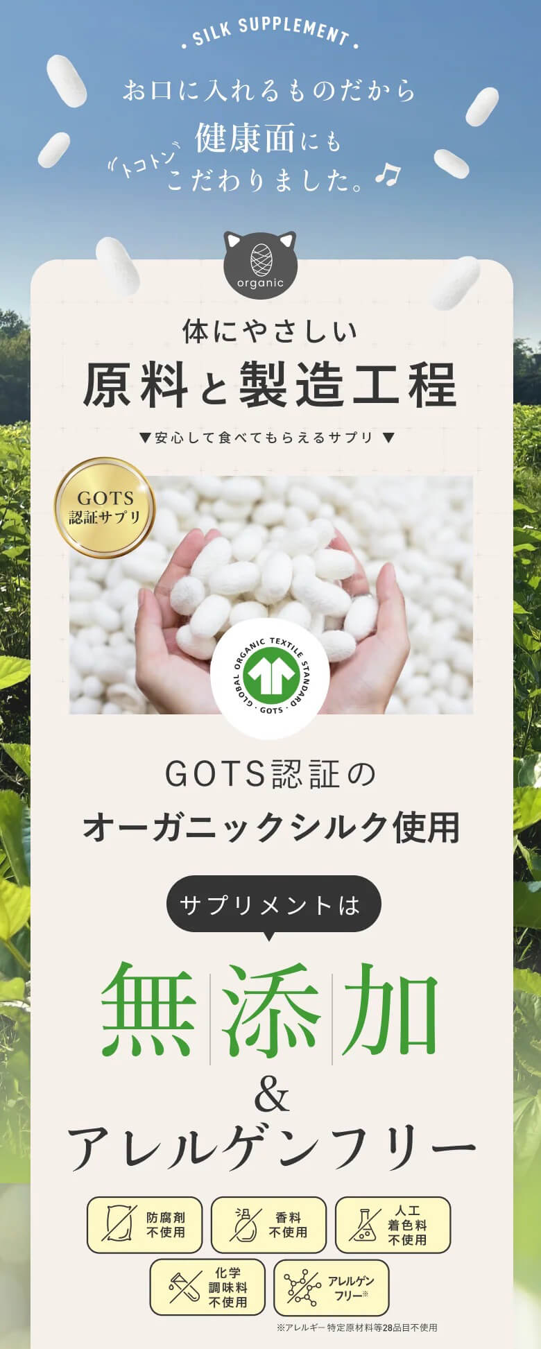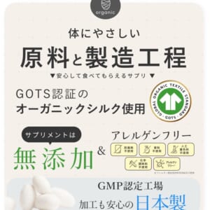 国際基準であるGOTS認証のオーガニックシルクを使用し、使用製造工程においても防腐剤、香料、人工着色料、化学調味料などケミカルなものは不使用。