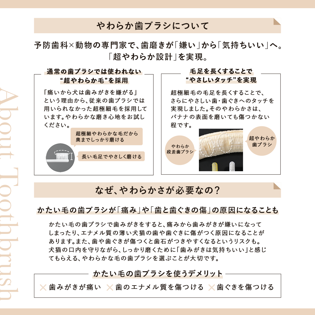 愛犬や愛猫が歯みがきを嫌がる理由の一つに、「歯ブラシが痛くて嫌いになってしまうこと」があります。