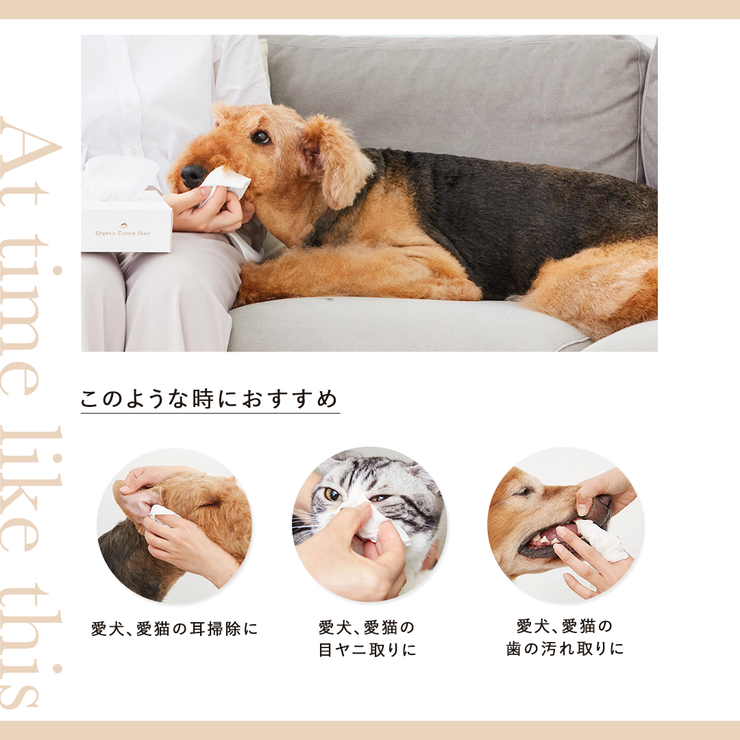 目や口などのデリケートな場所のふき取りケアや歯磨きにもお使いいただける、汚れがとりやすいよう粗めに編んだオーガニックコットンシート。
