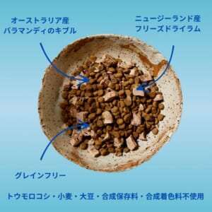 バラマンディ(白身魚)、フィッシュミール、サーモンミール、ツナミール、動物性油脂、レンズ豆、ヒヨコ豆粉、エンドウ豆、フリーズドライラム、タピオカデンプン、エンドウ豆プロテイン、ビーフ&フィッシュエキス、ソラ豆プロテイン、サーディンミール、ビートパルプ、セルロース、アルファルファ、チコリ、ユッカエキス、ビタミン類(A、B1、B2、B6、B12、D3、E、K、コリン、ビオチン、パントテン酸、葉酸、ナイアシン)、ミネラル類(ナトリウム、カリウム、銅、カルシウム、鉄、マンガン、セレン、亜鉛)、アミノ酸類(タウリン、メチオニン)、酸化防止剤(クエン酸、ミックストコフェロール、ローズマリーエキス)