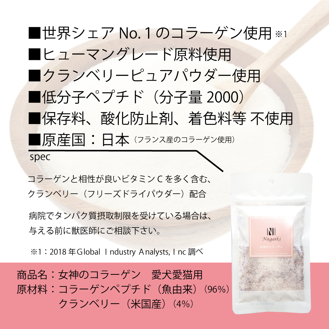 ・被毛の質を向上: コラーゲンは被毛の健康も促進し、艶やかでしなやかな毛質を保ちます。