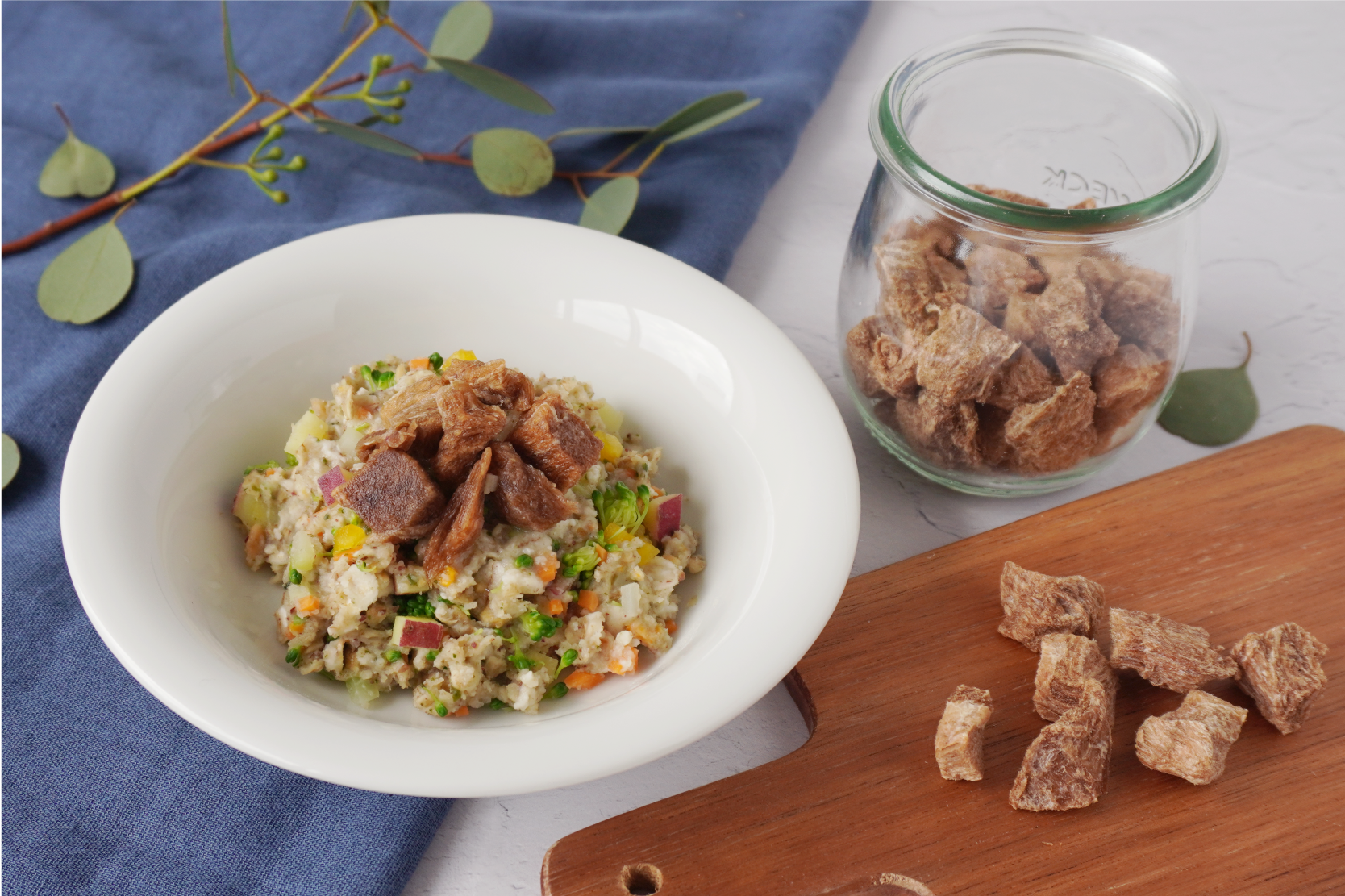 お湯で戻すと生肉をボイルしたような香りと食感が楽しめ、ペットの食欲が増進します。