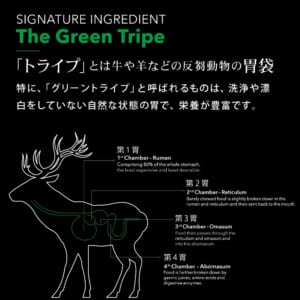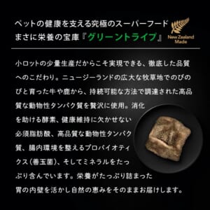「ラムwithグリーントライプ」は、ニュージーランドの牧草地で放牧されている羊の肉からなる動物性タンパク質源のブレンドです。