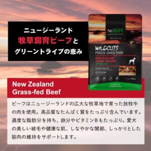 「ビーフwithグリーントライプ」は、ニュージーランドの牧草地で放牧されている牛の肉で構成される動物性タンパク質源のブレンドです。