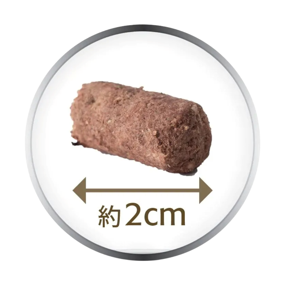また、一般的なドライフードのように、肉食動物である犬にとって不要な、穀類・イモ類・豆類などの、粘性の高いツナギや量増しとしての原材料を一切使用していないため、1粒1粒が柔らかく、簡単に、ほぐせるようになっています。