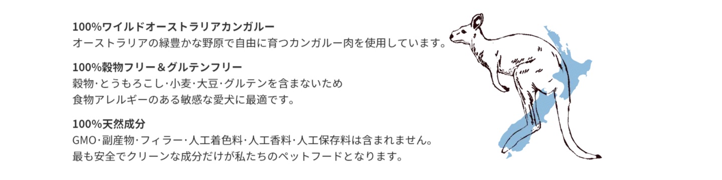 オーストラリアに生息する野生のカンガルー肉を使用したグレインフリーフード。食物アレルギー対策として理想的な野生のカンガルー肉は、一切の抗生物質やホルモン剤を含まず、肉質は高たんぱく質・低脂肪・低コレステロール。また、他の赤肉より共役リノール酸(CLA)が豊富に含まれており、日々の健康や体重調整や重要な多くの身体機能をサポートします。抗酸化作用や整腸作用を持つ新鮮なリンゴ、パパイヤ、ニンジン、ホウレンソウなどを使用しています。