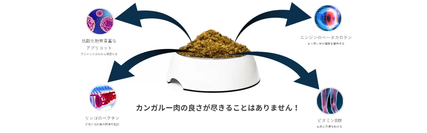 カンガルー生肉、ポテト、ニンジン、ココナッツオイル、タピオカ、フラックスシード、パパイヤ、アップル、クランベリー、ブルーベリー、マンゴー、バジル、ローズマリー、タイム、ペパーミント、ほうれん草、天然フレーバー、醸造用酵母、リン酸二カルシウム、シーソルト、塩化コリン、硫酸マグネシウム、ビタミンA、ビタミンD3、ビタミンE、硝酸チアミン、リボフラビン、パントテン酸カルシウム、ナイアシン、塩酸ピリドキシン、葉酸、ビタミンB12、硫酸第一鉄、硫酸銅、硫酸マンガン、硫酸亜鉛、ヨウ素酸カルシウム、亜セレン酸ナトリウム、硫酸コバルト、タウリン、緑茶エキス、ローズマリーエキス、スペアミントエキス、酸化防止剤(ミックストコフェロール)