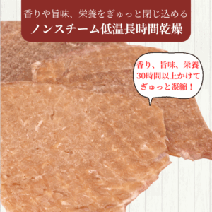 新鮮なエゾ鹿の乳房部分だけをエアドライ(長時間低温乾燥製法)で旨味と栄養を凝縮しました。