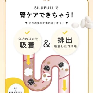 ナノレベルの多孔質構造で難消化性の「カラダシルク」は、体内の老廃物を吸着し、体外へ排出する働きが期待されています。