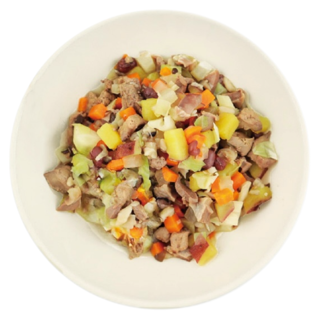 鶏肉(砂肝、レバー)、さつまいもペースト、さつまいも、キャベツ、にんじん、だいこん、ぶなしめじ、小豆、天日塩
