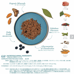 「より自然に、より新鮮に。」という理念のもと、全てのレシピに100%新鮮な生肉と天然素材を使用し、人工着色料・保存料・ミートミール・副産物を一切使わずに作られています。