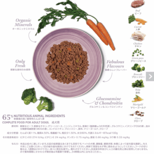 :新鮮なビーフ、新鮮なチキン、グリーンピース、ニンジン、ミネラル、亜麻仁(脂肪酸w3の天然源)、グルコサミン、イヌリン(FOSの源)、加水分解酵母細胞壁(MOSの源)、コンドロイチン、ブロッコリー、昆布、マリーゴールド、クローフ