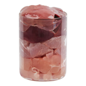 バイエルンのお肉屋さんが厳選したお肉97%ヒューマングレード(人間用食品グレード)の材料のみが使用されており、合成添加物を使用せず新鮮な心臓・胃腸・レバーの「品質の高い内臓」に加えて、亜麻仁油・海藻や愛犬にとって必要な栄養素の一つのカルシウムは有機卵殻の粉を使用しています。