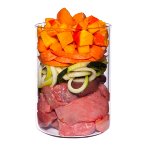 肉の含有量は62%、野菜・果物・ハーブ等を35%使用し愛犬にとって必要な栄養素の一つのカルシウムは有機卵殻の粉を使用しています。