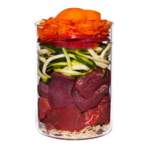 1種類のお肉だけで無くヒューマングレード(人間用食品)の材料のみが使用されており、合成添加物を使用せず新鮮な筋肉や心臓、レバーなど「品質の高い内臓」に加えて、野菜・果物・ハーブなど20種類以上の健康素材が愛犬の健康を守り、食欲をそそる香りと美味しさを提供します。
