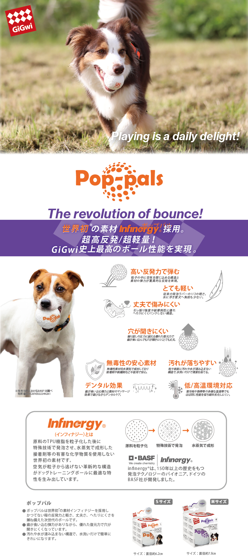 ポップパルは世界初の素材インフィナジーを採用しかつてない程の反発力と軽さ、丈夫さ、へたりにくさを兼ね備えた次世代のボールです。