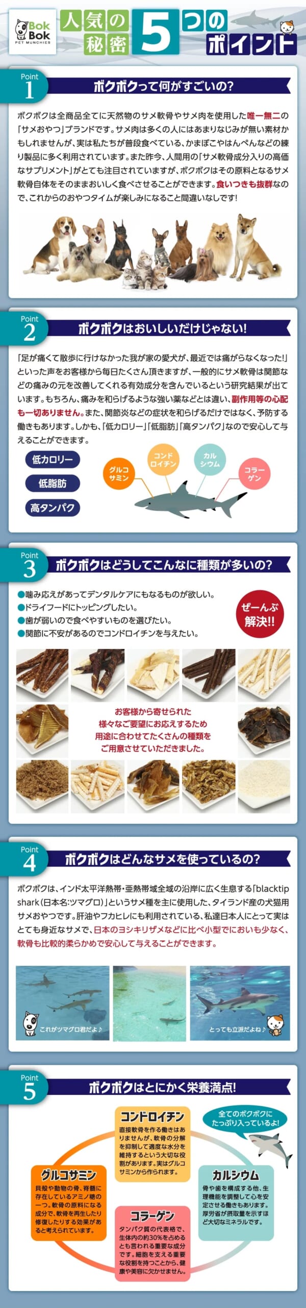 BokBok(ボクボク)は、インド太平洋熱帯・亜熱帯域全域の沿岸に広く生息する「blacktip shark(日本名:ツマグロ)」というサメ種を主原材料に使用した、タイランド産の犬用サメおやつです。